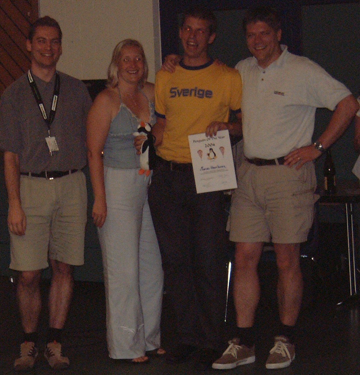 During the World Games in Sursee, Switzerland in 2004 the "Penguin Of The Year" award was presented for the 4th consecutive year. The winner was Marcus Henriksson from Sweden, the first Swedish player to receive the honourable award. Here are some photos of the lucky winner: